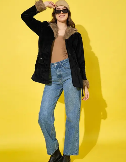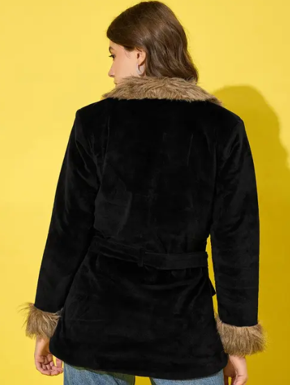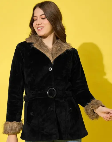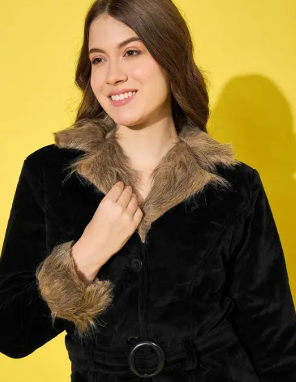 winter velvet jacket, featuring a plush fur lining for ultimate relaxed. Designed with a classic button closure and a flattering belted waist, it offers a tailored fit. Two spacious pockets add practicality, making this luxurious jacket perfect for both casual and formal occasions. The model (height 5’8) is wearing a size M. Size Chart In Inches -Size : S “Bust 38 Length 28” Size : M “Bust 40 Length 29” Size : L “Bust 42 Length 30” Size : XL “Bust 44 Length 31” Size : XXL “Bust 46 Length 32”